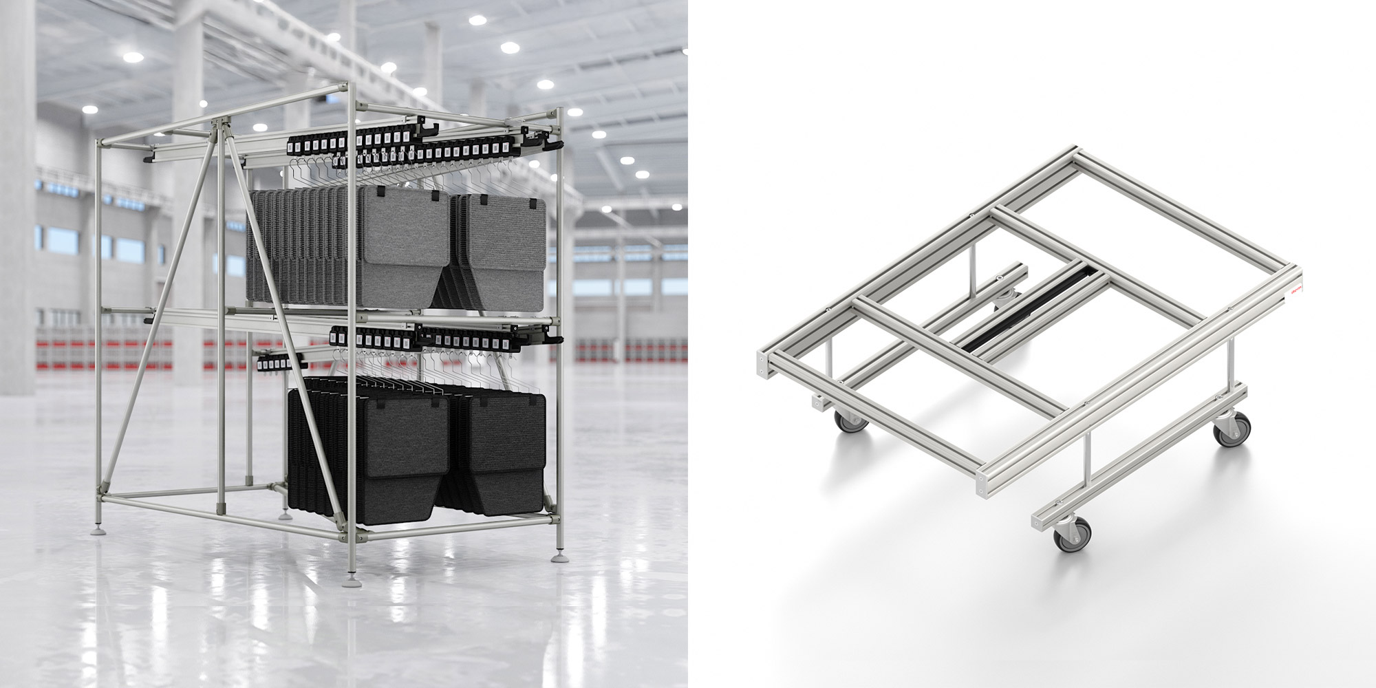 Das item Hängefördersystem eignet sich besonders für den Transport von Bauteilen, die für Kleinladungsträger (KLT) zu groß sind oder sich leicht verfangen. Komponenten wie Kabelbäume und Matten können hängend oder in Taschen optimal bereitgestellt werden. Dazu wird das Material mit einem speziell konzipierten Laufwagen in ein Laufschienenprofil eingehängt. Mit einer Neigung von nur 3° läuft das Transportgut mithilfe seines Eigengewichts über das Laufschienenprofil zur Entnahmestelle. Der Laufwagen ist ESD-sicher. Zusätzlich ist er so konzipiert, dass er Verkantungen und Selbsthemmungen entgegenwirkt sowie Pendelbewegungen ausgleicht. Mit der Vereinzelung 6 Laufwagen D37-32 sorgen Sie zudem für eine sequentielle Zustellung des Transportguts. Die Laufschiene lässt sich einfach in der gewünschten Höhe und mit der bevorzugten Neigung in einem Rahmen aus dem Profil D30 oder in bereits bestehende Gestelle integrieren.
