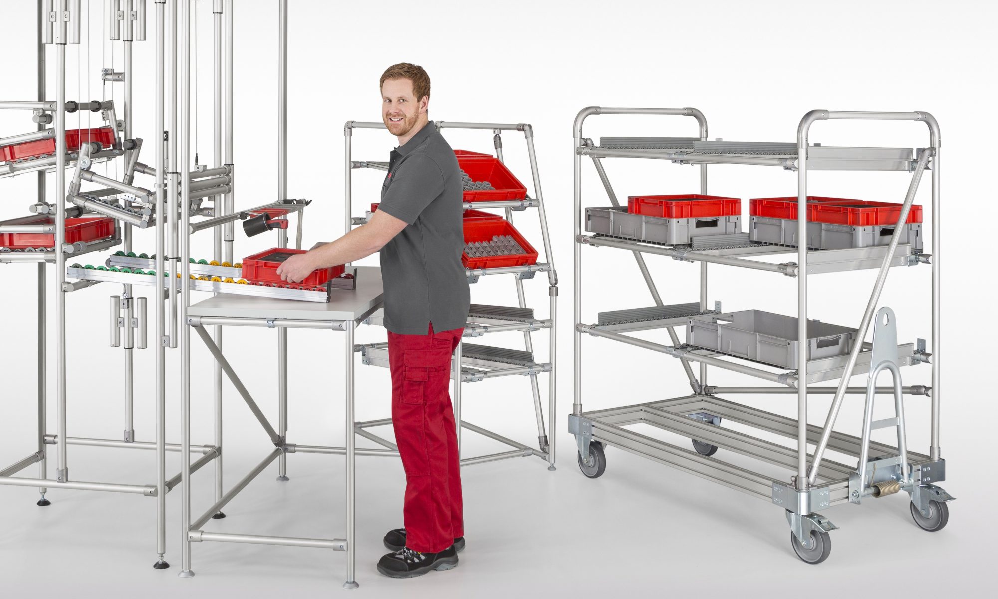 Lean-Production-Baukästen der zweiten Generation bieten ein durchgängiges System für Intralogistik und Betriebsmittel. Auf diese Weise wird ein sanfter Übergang zwischen Arbeit und Bewegung ermöglicht. Die Kombination aus Aluminiumrohr und stabilem Aluminium-Verbinder erzeugt hohe Haltekräfte, die auch unter dynamischer Belastung nicht abnehmen. Das wirkt sich positiv auf die Dauerfestigkeit aus. Weiterhin kann mit weniger Material stabil konstruiert werden.
