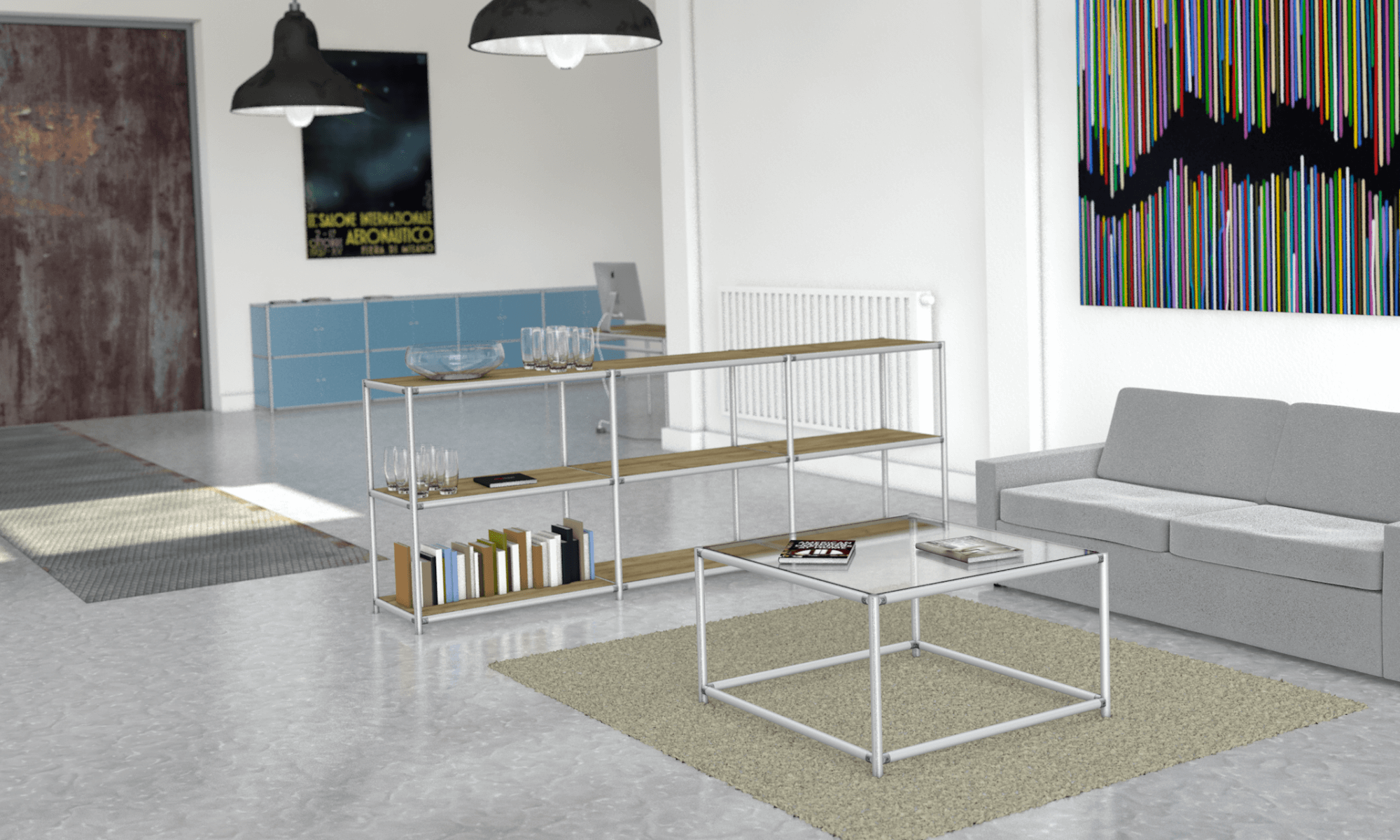 Mittlerweile wurden bereits einige D30-Regale fertiggestellt, die nun einen Raum unserer Solinger Firmenzentrale verschönern. Wie die hier gezeigten Renderings unterstreichen, ist aber noch viel mehr möglich. Hierzu gehören neben Tischen auch die im Hintergrund platzierten Sideboards. Sie sind gewissermaßen noch rein „virtuell“, einer Umsetzung steht aber überhaupt nichts im Wege. Beim Konzept unserer „schlanken Möbel“ geht es ausdrücklich um einfache Komplettlösungen ohne Schnickschnack, die Funktionalität mit Eleganz verbinden. Wer also Mobiliar für loftartige Wohn- oder Bürosituationen sucht, kann sich gerne an uns wenden.