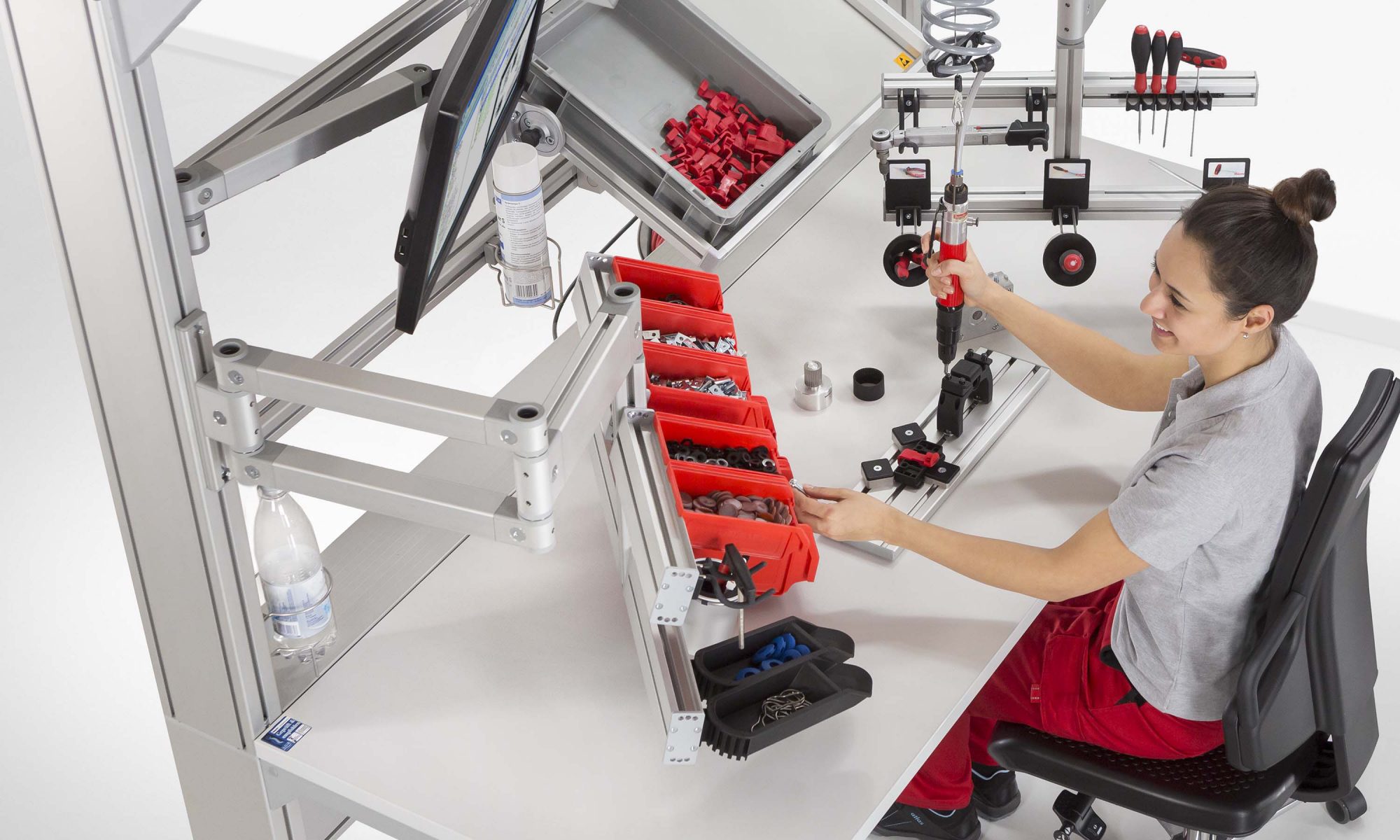 Es macht sich schnell bemerkbar, wenn man viele Stunden in ein und derselben Position verbringt. Verspannungen, wenn nicht gar Schmerzen sind häufig die Folge. Überall, wo es prozessbedingt möglich ist, empfiehlt sich daher der Wechsel zwischen einem Sitz- und Steharbeitsplatz. Dies ist an einem höhenverstellbaren Arbeitstisch besonders gut möglich. Es mag kurios klingen, doch der Mensch sitzt erst seit 250 Jahren dauerhaft. Daher sind wir an diese Position im Grunde nicht gewöhnt. Wenn der Werker schon eine Weile im Sitzen gearbeitet hat, ist es ergonomisch sinnvoll, von der sitzenden zur stehenden Arbeitsposition zu wechseln. Dadurch wird der Rücken deutlich entlastet. Das ideale Verhältnis: 80 % dynamisches Sitzen – 20 % Stehen.